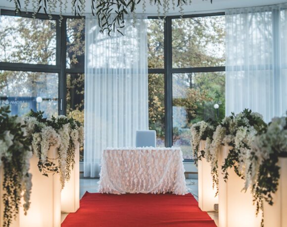 Sala ogrodowa to nasza największa sala, która znajduje się na parterze i pomieścić do 250 Gości przy zachowaniu komfortu, miejsca na parkiet, zespół muzyczny i dodatkowe atrakcje. Jeżeli marzycie Państwo o ceremonii w miejscu wesela to dysponujemy również piękną przeszkloną salą z widokiem na otaczającą obiekt zieleń lub możemy zorganizować dla Państwa ślub w plenerze.